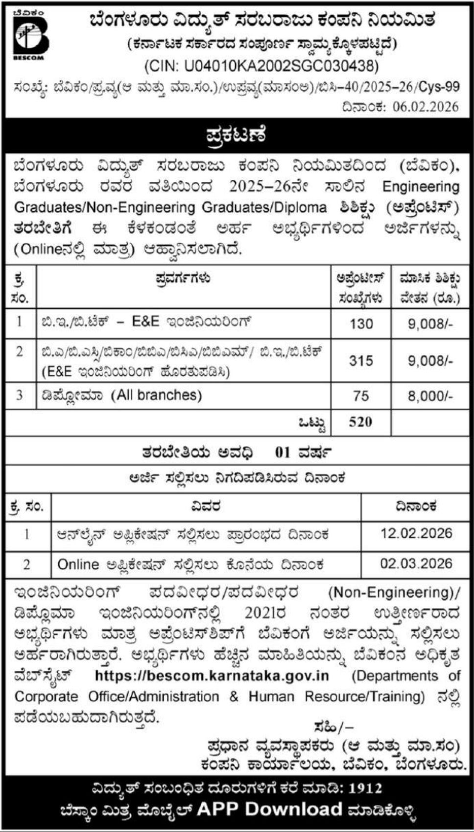 BESCOM Apprentice Recruitment 2026 : ಬೆಂಗಳೂರು ವಿದ್ಯುತ್ ಸರಬರಾಜು ಕಂಪನಿ ನಿಯಮಿತದಲ್ಲಿ ಅಗತ್ಯವಿರುವ ಅಪ್ರೆಂಟಿಸ್ ಹುದ್ದೆಗಳ ಭರ್ತಿಗೆ ಅರ್ಹ ಹಾಗೂ ಆಸಕ್ತ ಅಭ್ಯರ್ಥಿಗಳಿಂದ ಅರ್ಜಿ ಕರೆಯಲಾಗಿದೆ. ಹುದ್ದೆಗಳ ಭರ್ತಿಗೆ ಸಂಬಂಧಿಸಿದಂತೆ ಹುದ್ದೆಗಳ ಸಂಖ್ಯೆ, ಶೈಕ್ಷಣಿಕ ಅರ್ಹತೆ, ವೇತನ, ಅರ್ಜಿ ಸಲ್ಲಿಕೆ ದಿನಾಂಕ ಹಾಗೂ ಇತರೆ ಮಾಹಿತಿಯನ್ನು ಈ ಕೆಳಗಡೆ ವಿವರವಾಗಿ ನೀಡಲಾಗಿದೆ ಪೂರ್ತಿ ಓದಿ.