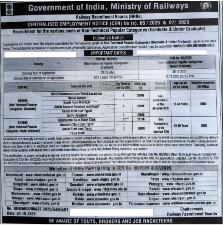 RRB NTPC Recruitment 2025 : Details of Vacancies