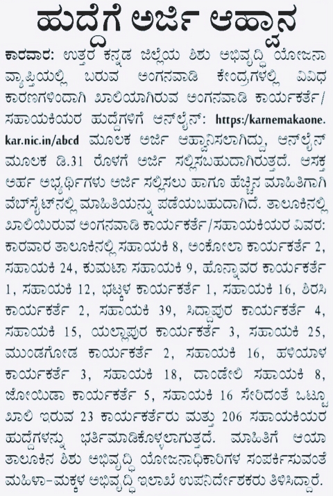 ಉತ್ತರ ಕನ್ನಡ ಜಿಲ್ಲೆಯ ಕಾರವಾರ, ಅಂಕೋಲಾ, ಕುಮಟಾ, ಹೊನ್ನಾವರ, ಭಟ್ಕಳ, ಶಿರಸಿ, ಸಿದ್ದಾಪುರ, ಯಲ್ಲಾಪುರ, ಮುಂಡಗೋಡ, ಹಳಿಯಾಳ, ದಾಂಡೇಲಿ, ಜೊಯಿಡಾ ವ್ಯಾಪ್ತಿಯಲ್ಲಿ ಹುದ್ದೆಗಳು ಖಾಲಿ ಇದೆ.